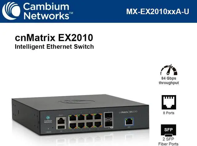 The Cambium cnMatrix EX2010 Switch 224Port Gigabit Smart Managed Switch is a high-performance, fully managed enterprise-grade switch designed to simplify network deployment and management while delivering unified wired and wireless connectivity. When integrated with cnPilot WLAN access points and the cnMaestro management system, the EX2010 provides a feature-rich, scalable network infrastructure that enhances performance, security, and end-user experience.