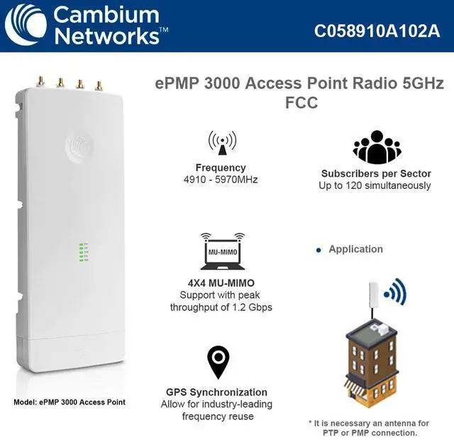 The Cambium ePMP 3000 AP represents a third-generation access point designed for high-density broadband wireless deployments. This 5GHz unit incorporates 4×4 MU-MIMO technology to double sector capacity compared to traditional 2×2 systems. It operates within the 4910 to 5970 MHz frequency range. This hardware supports aggregate throughput of up to 600 Mbps. It provides a scalable solution for service providers facing increased bandwidth demands. The architecture utilizes advanced MAC protocols to maintain low latency across high subscriber counts.
