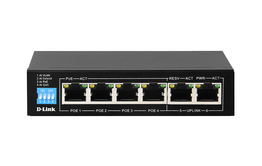 The D-Link DGS-F1006P Switch serves as a high-performance Layer 2 unmanaged solution designed for small-to-medium enterprise environments requiring robust Power over Ethernet capabilities. This hardware features four 10/100/1000 Mbps PoE ports alongside two dedicated 10/100/1000 Mbps uplink ports to ensure non-blocking data throughput. The architecture supports a total switching capacity of 12 Gbps, providing sufficient bandwidth for high-definition IP surveillance and wireless access point deployments. Consequently, network administrators can consolidate power and data over a single Ethernet cable, reducing infrastructure complexity and installation costs.