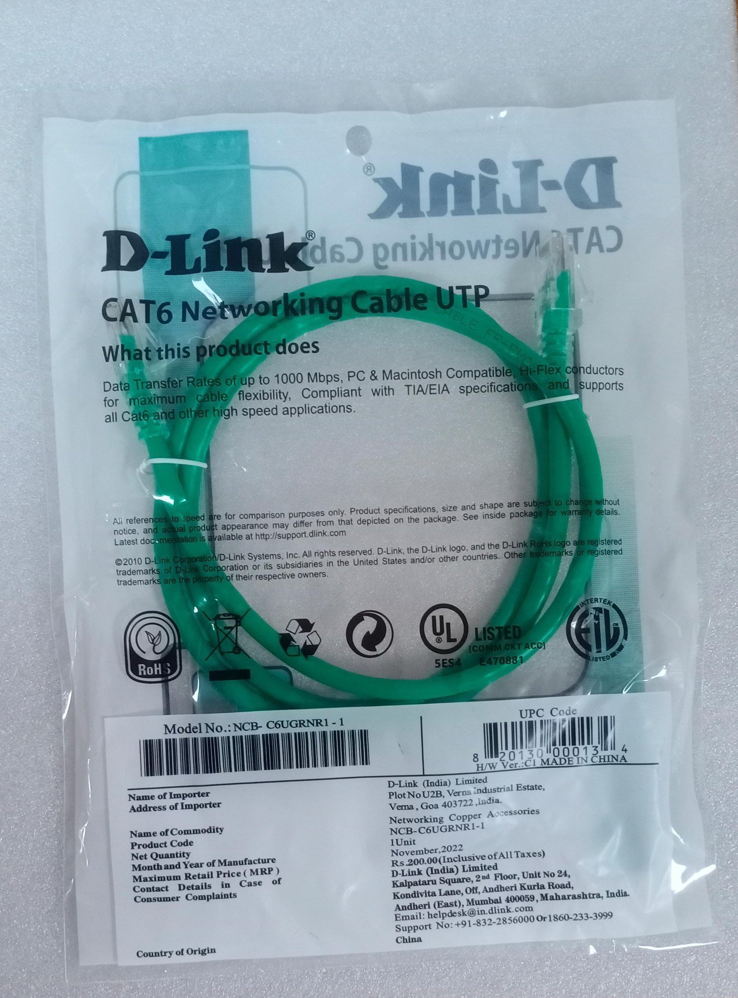 D-Link NCB-6AUGRNR1-3 Patch Cord