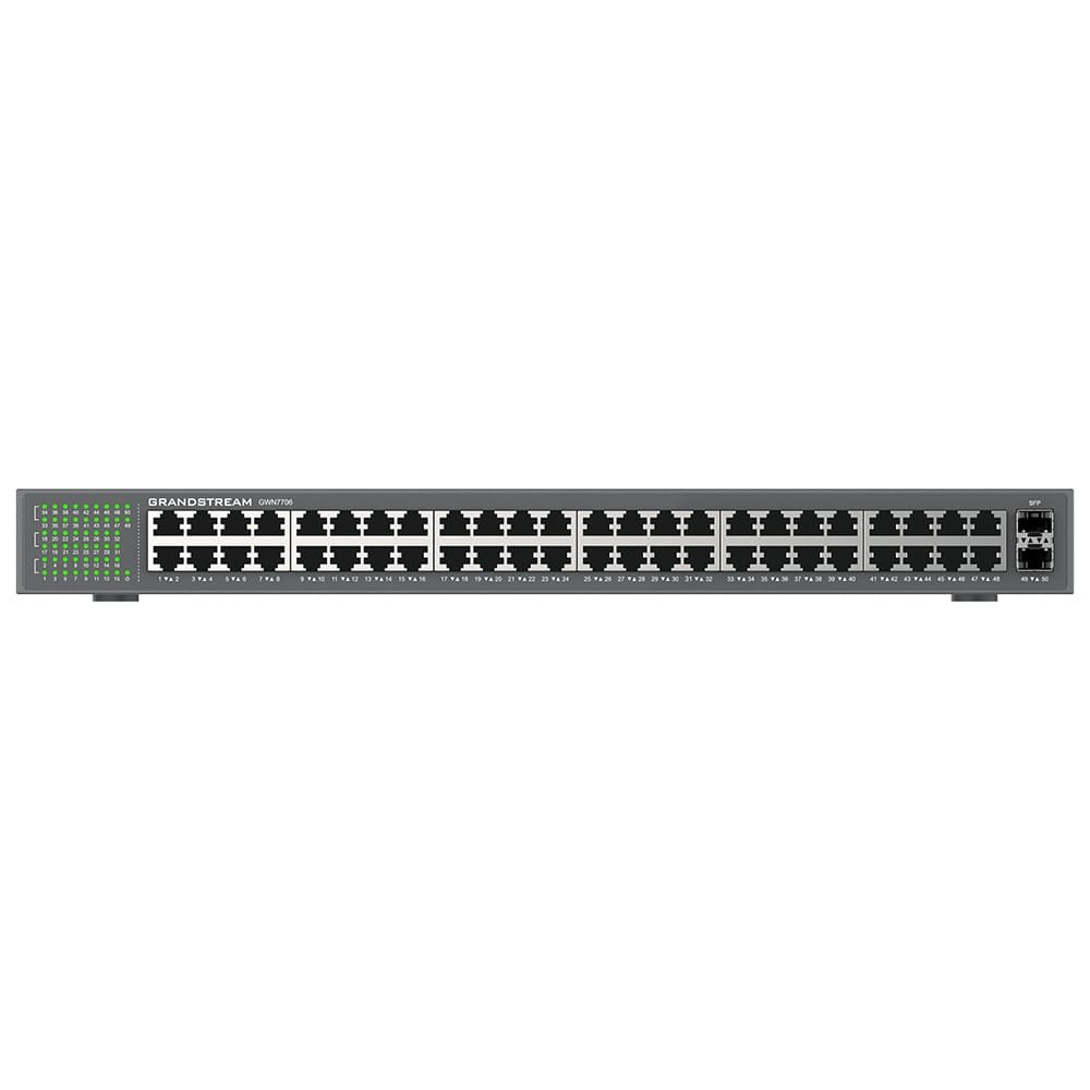 The Grandstream GWN7706 48Port Gigabit Unmanaged Network Switch is a 48-port unmanaged Gigabit switch featuring 48× RJ45 Gigabit ports and 2× SFP fiber uplink ports, making it ideal for medium and large enterprise networks, schools, hotels, data floors, and surveillance deployments.
