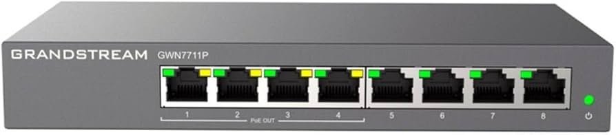 The Grandstream GWN7711 8Port Gigabit Layer 2 Lite Managed Switch with 4× PoE/PoE+/Passive PoE is an advanced Layer 2 Lite Managed Gigabit Switch featuring 8 Gigabit ports, including 4 PoE/PoE+ ports with intelligent dynamic power allocation. Designed for powering IP surveillance, Wi-Fi access points, VoIP phones, and other PoE-enabled endpoints, it offers up to 60W total PoE budget and supports both 802.3af/at and 24V/48V passive PoE-out modes.