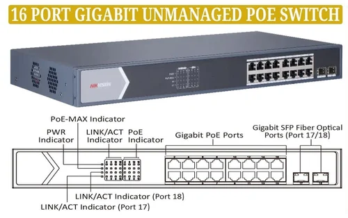 The Hikvision DS-3E0518P-E is a high-performance 16-Port Gigabit Unmanaged PoE Switch engineered specifically for video surveillance and high-bandwidth data transmission. With 16 Gigabit PoE ports, 1 Gigabit RJ45 uplink, and 1 Gigabit SFP uplink port, it delivers seamless connectivity for IP cameras, NVR systems, and enterprise LAN environments requiring simplicity, power efficiency, and reliability.