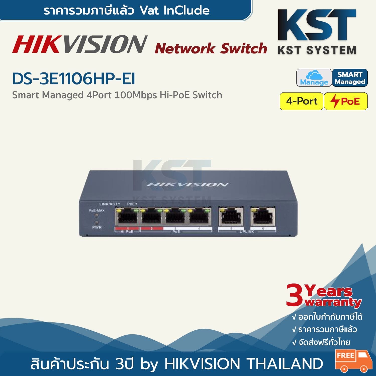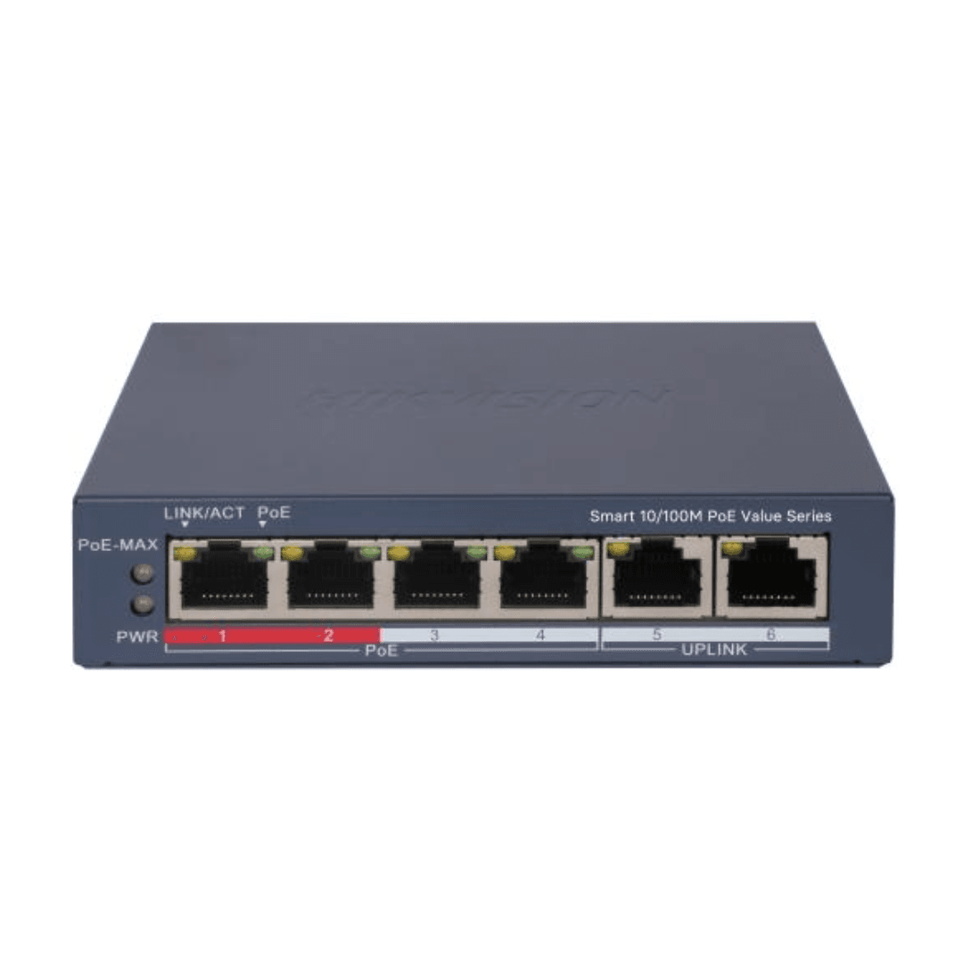 The Hikvision DS-3E1106HP-EI 4Port Fast Ethernet Smart PoE Switch is a smart-managed Fast Ethernet PoE switch engineered for professional surveillance, SMB networks, and structured deployments requiring intelligent power delivery and extended-range data transmission. Featuring 4 × 10/100 Mbps PoE ports and 2 × 10/100 Mbps uplink ports, the switch supports IEEE 802.3af/at/bt standards, offering advanced PoE capacity including Hi-PoE (60 W) on Port 1 for power-intensive devices.