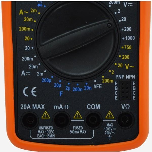 Dedicated slots allow for hFE transistor testing and diode forward voltage drop measurements.