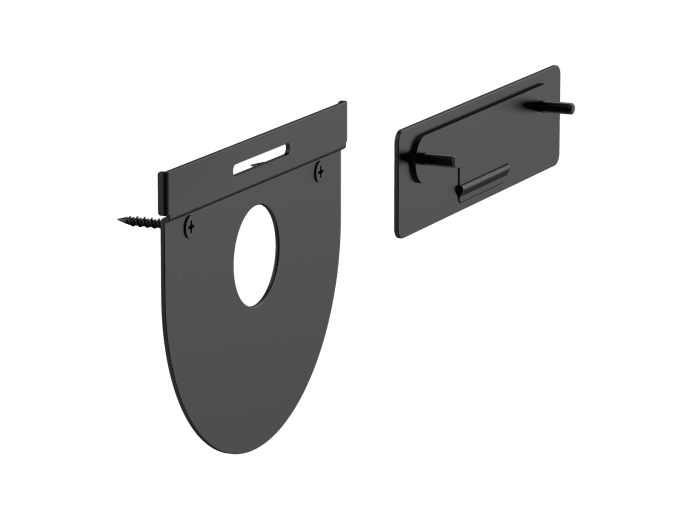 The mounting plate supports direct wall attachment or integration with standard US and European junction boxes.