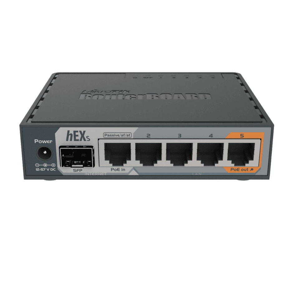 The MikroTik hEX S is a powerful, compact 5-port Gigabit Ethernet router with SFP support, PoE output, and a dual-core 880 MHz CPU. Designed for locations where wireless connectivity is not required, it delivers advanced RouterOS features, IPsec hardware encryption, and supports The Dude server package for network monitoring. Ideal for small offices, network enthusiasts, and professional setups.