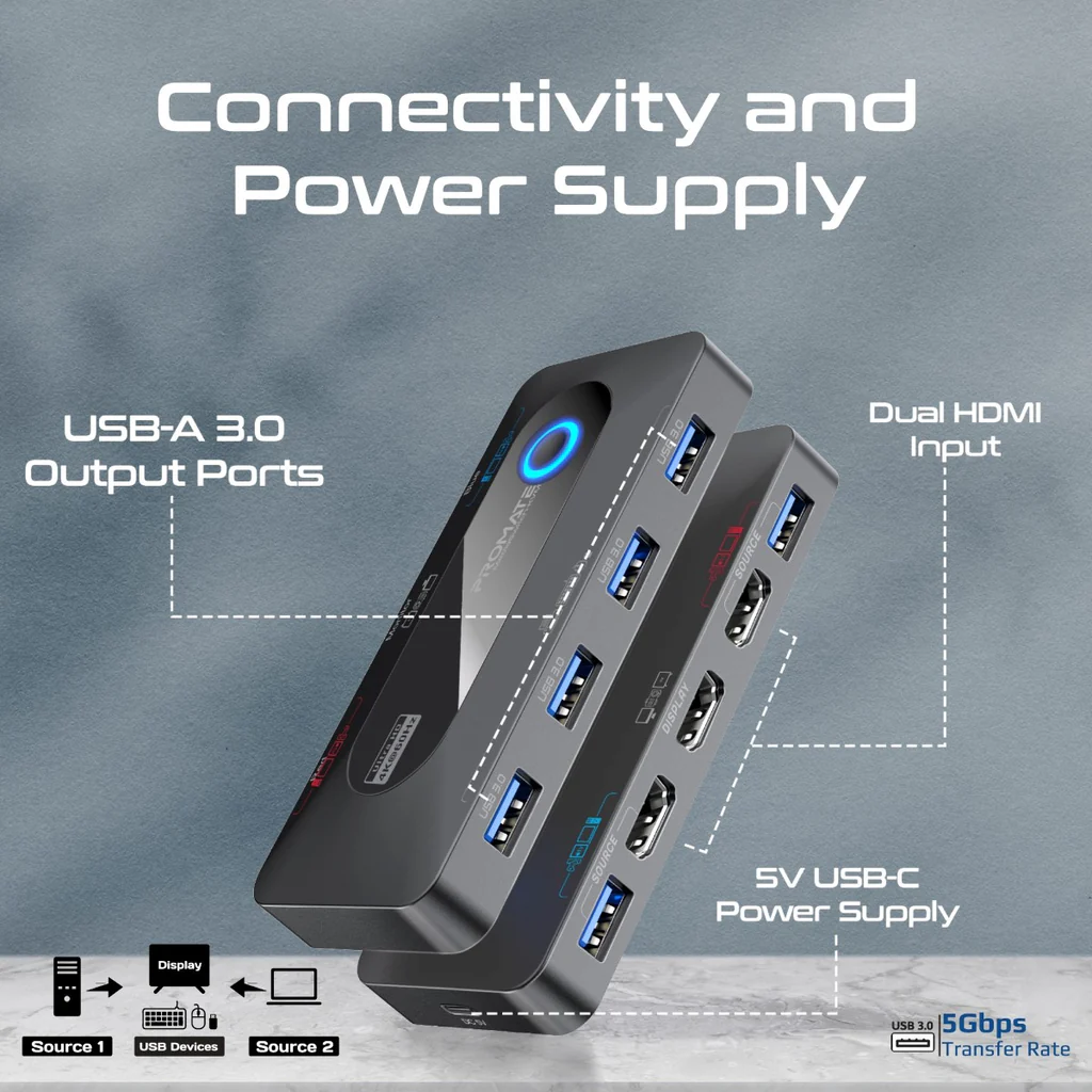 The Promate MediaSwitch-KVM HDMI Switch allows network engineers and IT professionals to manage two separate computers through a single workspace console. This hardware solution supports HDMI 2.0 bandwidth requirements. It delivers high-definition video at 3840 x 2160 resolution with a 60Hz refresh rate. Consequently, users experience fluid motion and sharp image details during complex technical workflows. The integrated USB architecture facilitates the sharing of human interface devices and storage peripherals across both connected systems. This eliminates the need for redundant hardware and optimizes desk space in high-density environments.