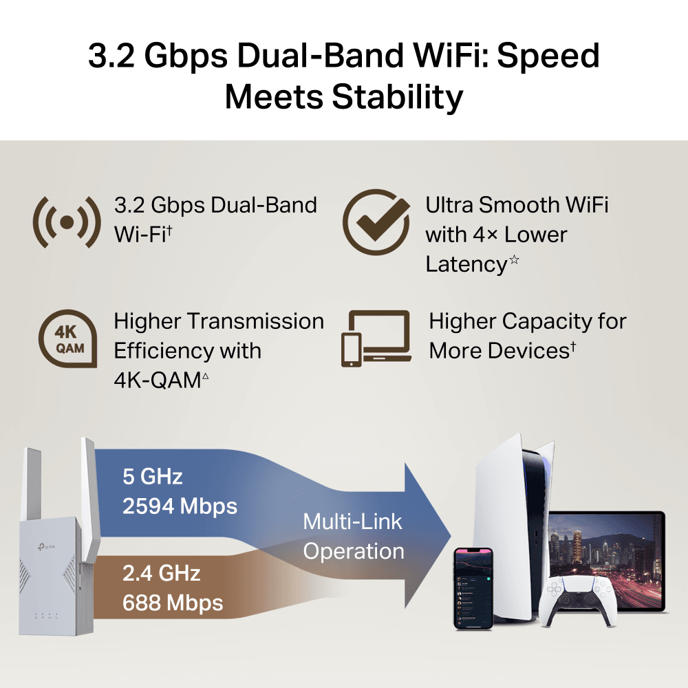 Achieves combined speeds up to 3.2 Gbps (2594 Mbps on 5 GHz + 688 Mbps on 2.4 GHz), delivering high throughput for demanding applications like 4K/8K streaming and online gaming.Multi-Link Operation (MLO)