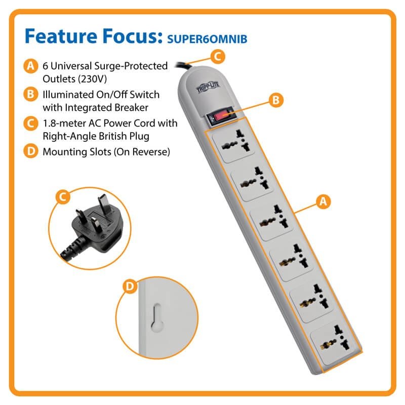 Tripplite 6-Universal Outlet Surge Protector, 230V, 750 Joules, 1.8M Cord