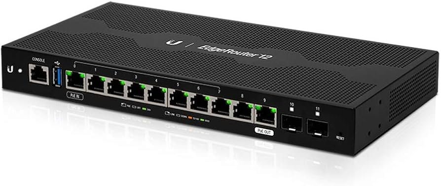 The Ubiquiti EdgeRouter 12 is a high-performance Gigabit router designed for advanced networking needs. Powered by a quad-core 1 GHz processor with 1 GB DDR3 RAM, it delivers reliable routing, switching, and security performance. Featuring 10 Gigabit RJ45 ports and 2 Gigabit SFP ports, the ER-12 provides maximum flexibility for enterprise, ISP, and advanced home networks.