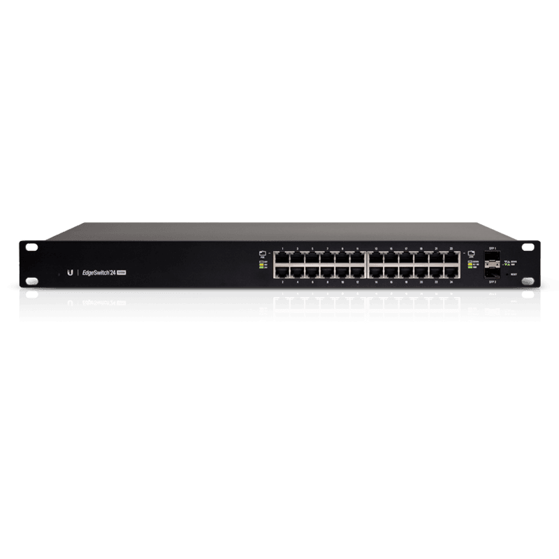 The Ubiquiti EdgeSwitch 24 (ES-24-250W) is a powerful, managed Gigabit switch featuring 24 RJ45 ports, 2 SFP uplinks, and a total PoE+ output of 250W. Built for performance and reliability, it delivers high-speed switching, advanced management capabilities, and fiber uplink support — ideal for small to medium enterprise networks.