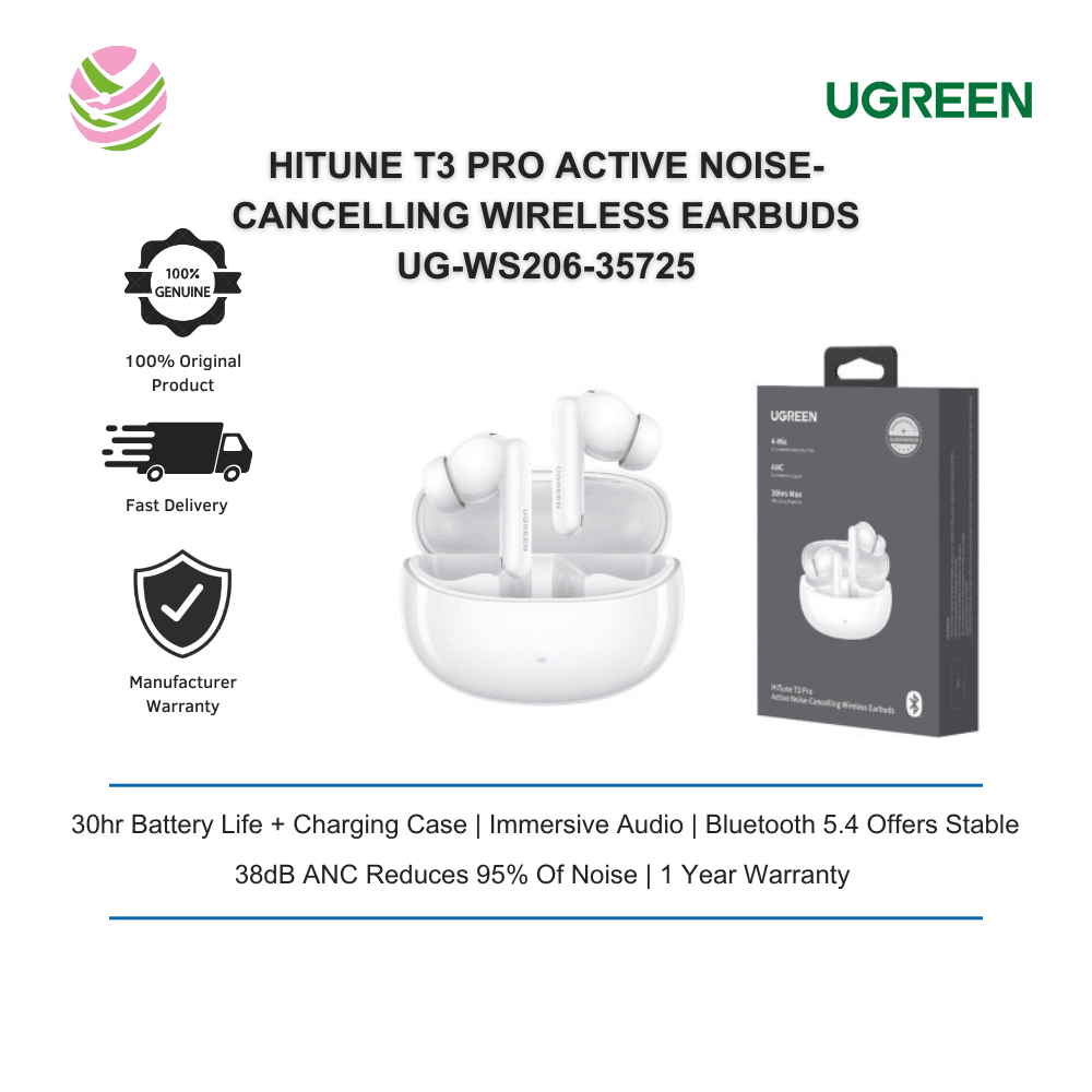 The Ugreen HiTune T3 Pro ANC Wireless Earbuds – White are engineered for superior audio quality and active noise cancellation. These earbuds offer a seamless wireless experience. They utilize advanced ANC technology to minimize ambient noise, providing an immersive listening environment. The ergonomic design ensures a comfortable and secure fit for extended use. The HiTune T3 Pro offers a stable connection and clear audio transmission.