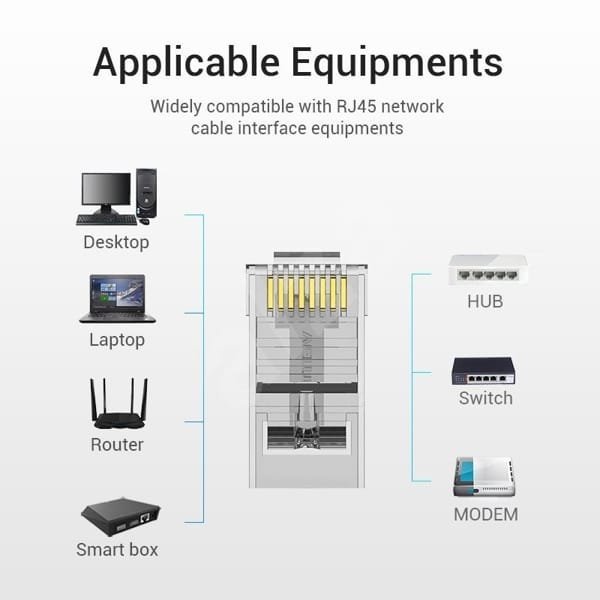 The Vention Cat5e RJ45 Plug provides a high-performance termination solution for unshielded twisted pair (UTP) network cabling in enterprise and SMB environments. These connectors utilize a standard 8P8C (8 Position, 8 Contact) configuration designed specifically for Category 5e infrastructure. Each modular unit features a transparent polycarbonate housing that facilitates immediate visual inspection of wire sequences according to T568A or T568B standards. This transparency minimizes termination errors and ensures consistent signal integrity across large-scale deployments. The internal architecture accommodates solid and stranded conductors, making these plugs versatile for both patch cord assembly and horizontal cabling terminations. By maintaining tight tolerances during the crimping process, these components ensure a secure mechanical connection and reliable electrical contact. Consequently, network engineers can maintain stable 10/100/1000 Mbps speeds across their copper infrastructure without the risk of intermittent connectivity caused by inferior connector tolerances.